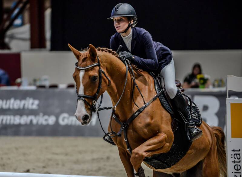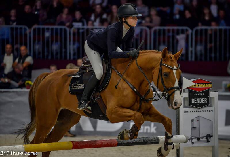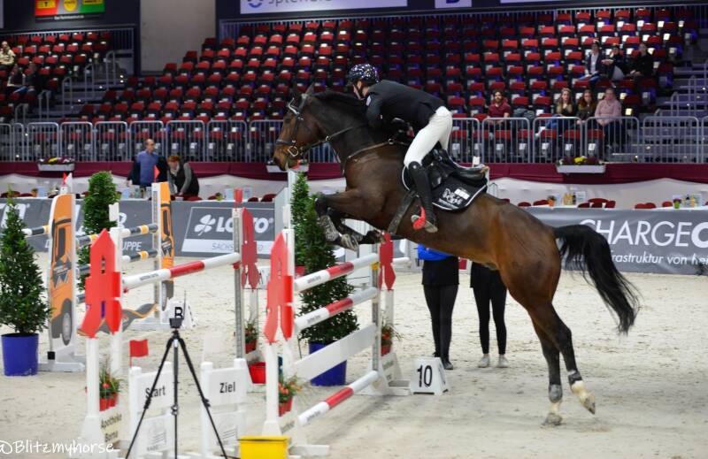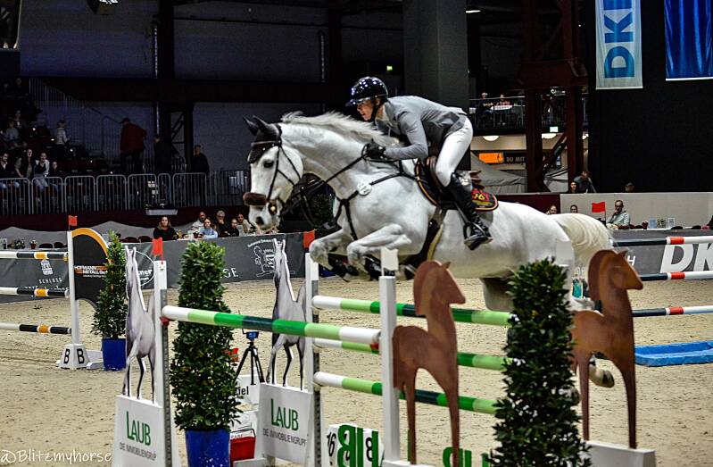 Während ich mir derweil den Kopf zerbreche beginnt das Finale der sächsischen Springtour 2024-Stilspringprfg.Kl.L mit Stechen 110cm. Das ist quasi ein Jugendcup in dem sich die Besten der ersten Runde in einer Finalrunde wieder treffen. In dieser Prüfung geht es flott vorwärts, aber schon im ersten Umlauf sticht einer hervor, Benno Schlegel mit seinem Pferd Little Meckie. Der Bengel sieht aus als könnte er kein Wässerchen trüben, aber zusammen mit seinem Pferd bildet er eine Einheit und im Stechen merkt man es, er will den Sieg ohne wenn und aber. Während vor ihm Lena Merx eine richtig starke Runde zur Führung reitet, legt der kleine Benno mit einem bärenstarken und kompromisslosen Ritt den Meilenstein zum Sieg. Die Halle steht Kopf.