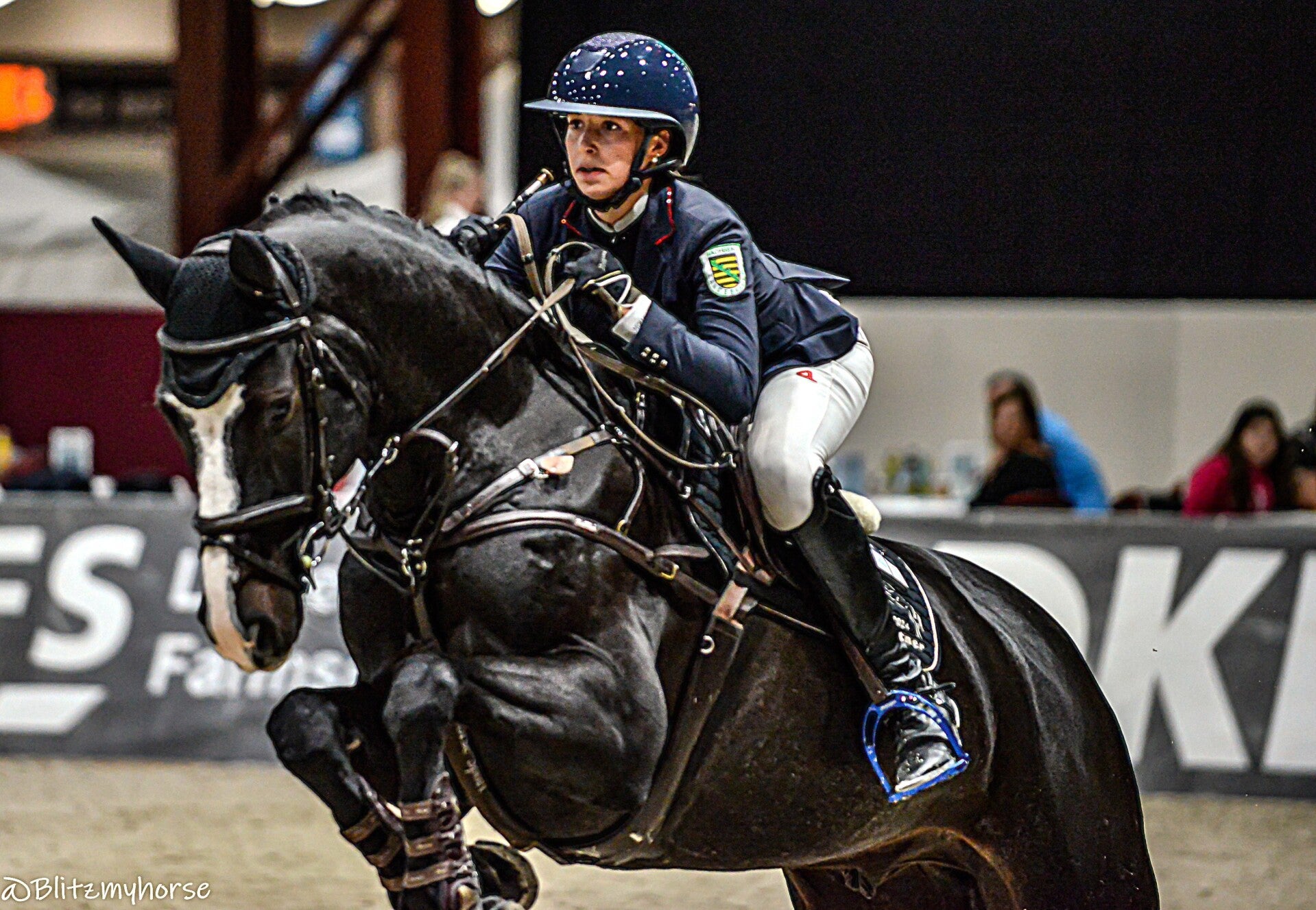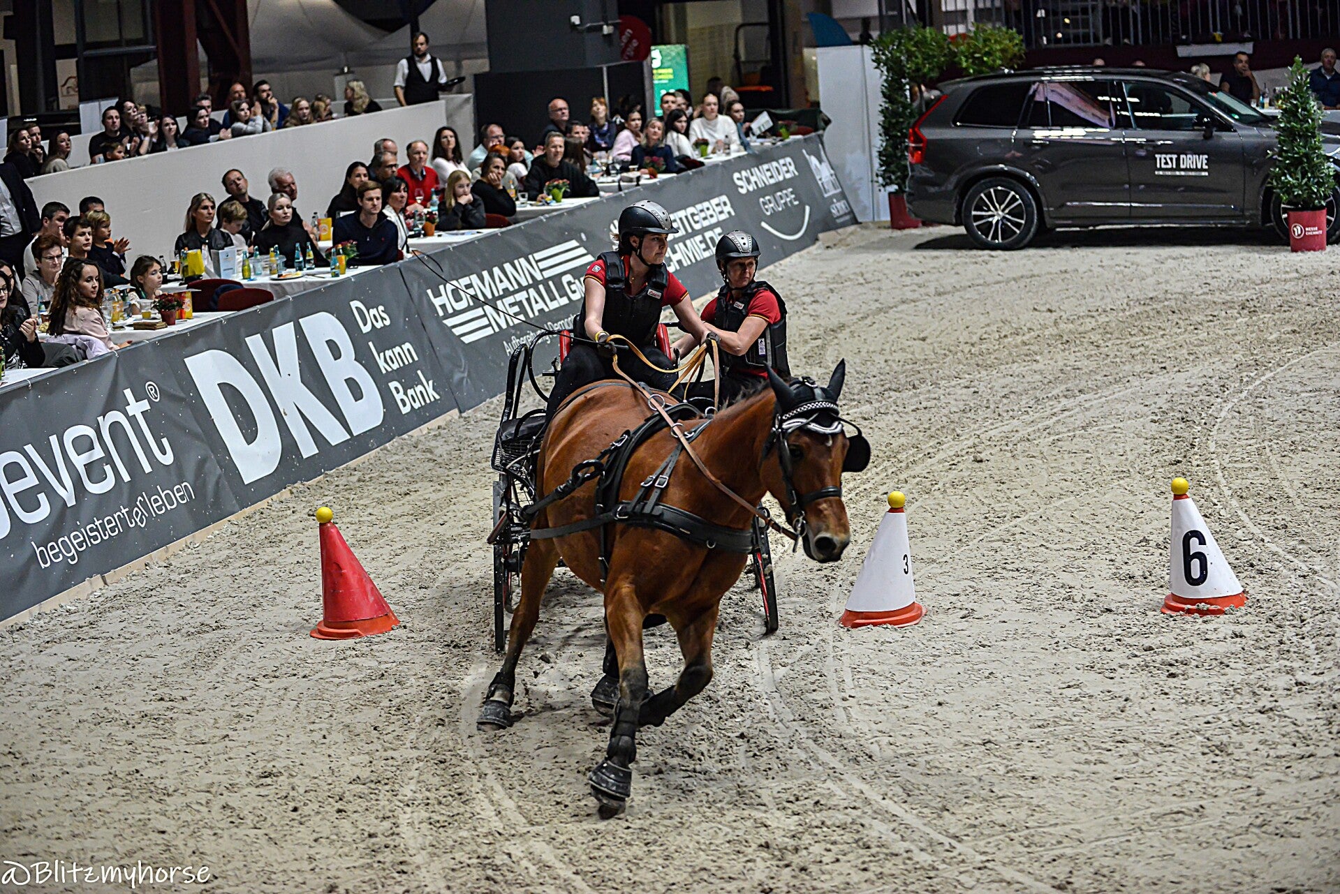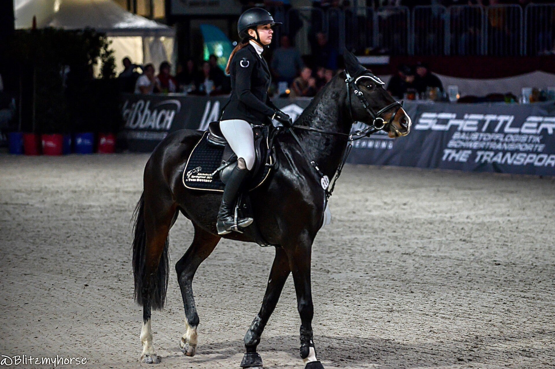 Als das S Springen vorbei ist geht es zum Auto. Obwohl jetzt noch ein M Springen kommt stehen schon die ersten Leute draußen die zur Pferdenacht wollen. Das erste was mir klar wird, wenn wir hier vom Parkplatz runter fahren werden wir mit Sicherheit nicht wieder drauf kommen. Ist ja jetzt schon gerammelt voll. Wir überlegen ob wir laufen, aber der nächste Automat ist ca. 3,5 Km entfernt. Schöne Scheiße, naja was willste machen. Wir fahren los zum Automat, dann geht es noch in einen Netto. Schrieb ich hier weiter vorne die Welt ist ein Dorf? Das kann man laut sagen den ich treffe beim Einkaufen einen weitläufig Bekannten den ich schon seit über 10 Jahren nicht gesehen habe... Vollgepackt mit Essen und drei Energy´s geht es wieder zurück, der Parkplatz weg, der neue Parkplatz einen halben Kilometer entfernt und dazu noch 5 Euro Gebühr. Scheiß egal, jetzt gibt es erstmal Abendbrot und nach einer kurzen Pause meldet sich Steffen. Wir bewegen uns dahin wo wir hin sollen, dort treffen wir Simona, die setzt dann alle Hebel in Bewegung und dann sind wir drinnen. Wir müssen allerdings auf eine der hinteren Ränge, da kommt es mir nun leider nicht zu gute das ich mein Equipment gewechselt habe. Naja, Hauptsache dabei und beim Fotografieren muss ich halt sehen das ich irgendwie aus Sch... Gold machen kann. Ich baller die Kamera auf die Lichtverhältnisse ein, so gut wie es ebent geht. Ich habe eigentlich nur eine Möglichkeit, ich kann nur direkt vor unseren Rängen Fotografieren, weiter weg von mir wird nicht viel gehen.