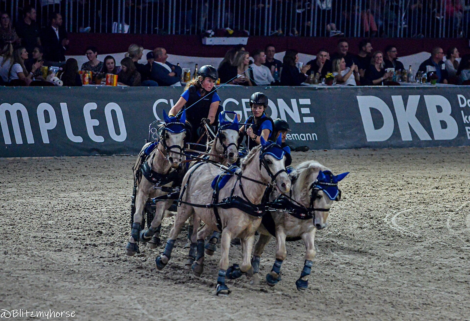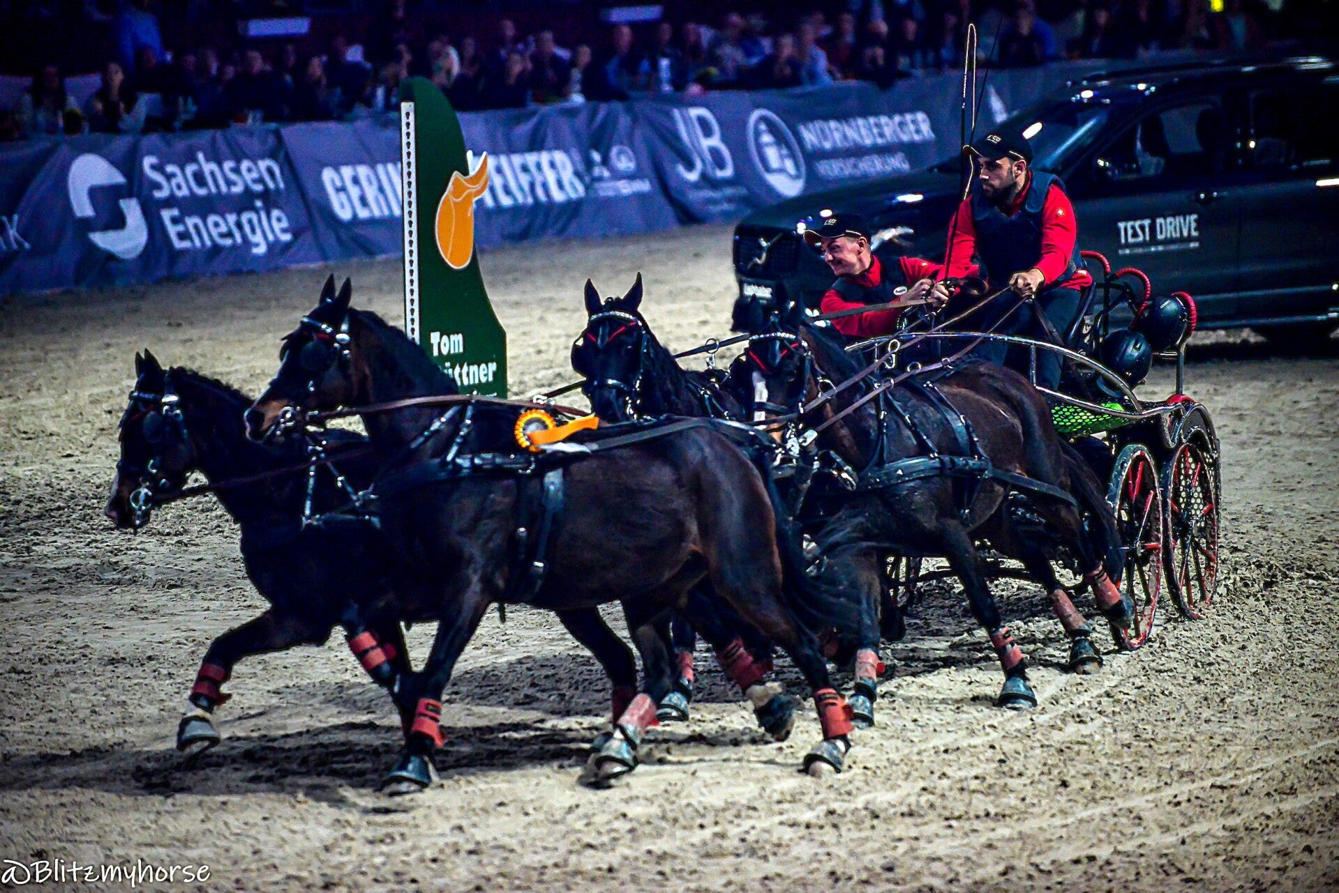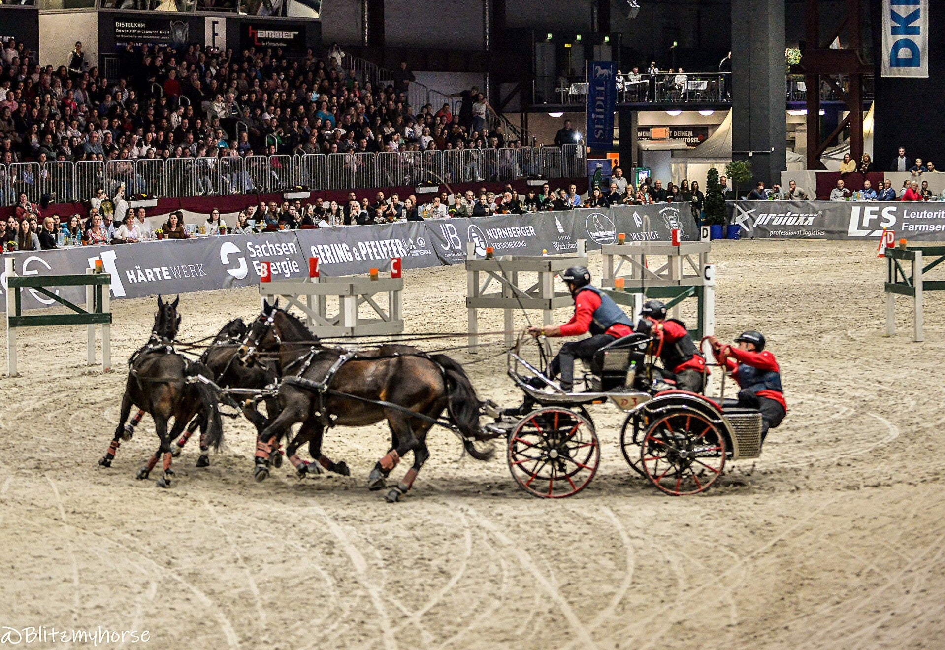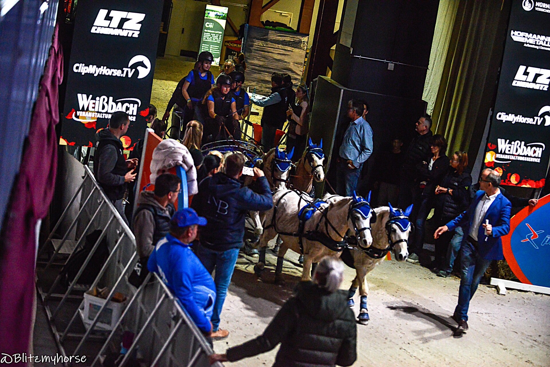 Die Veranstaltung beginnt mit Springreiten, ich werde davon keine Bilder weiter hochladen weil ja hier jetzt schon genug davon sind. Ich nutze die Zeit um weiter an meinen Kameraeinstellungen zu arbeiten. Ich bewege mich zwischen iso 4000 bis 6000 und das mit einem APSC Sensor. Ich könnte mir in den Arsch beißen, dass ich meine beiden Vollformatkameras zu Hause gelassen habe. Dann läuft noch bissel Showprogram, ich geh derweil mal runter und quassel bissel mit dem einen oder andern Bekannten. Dann geht es endlich los. Die Gladiatoren auf ihren Kutschen kommen. Drei Teams fahren gegen einander. Zu jedem Team gehört ein Vierspänner und ein Einspänner