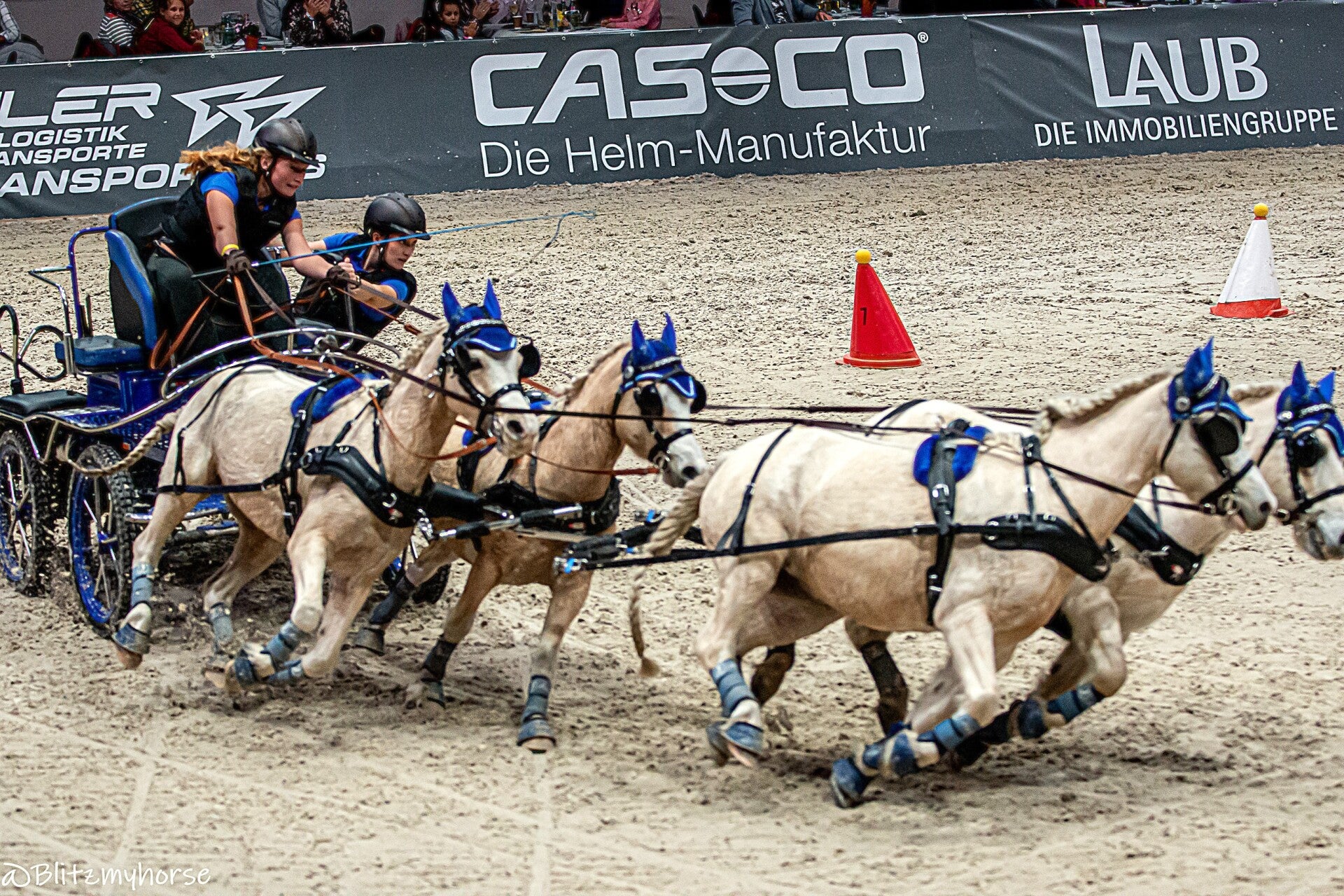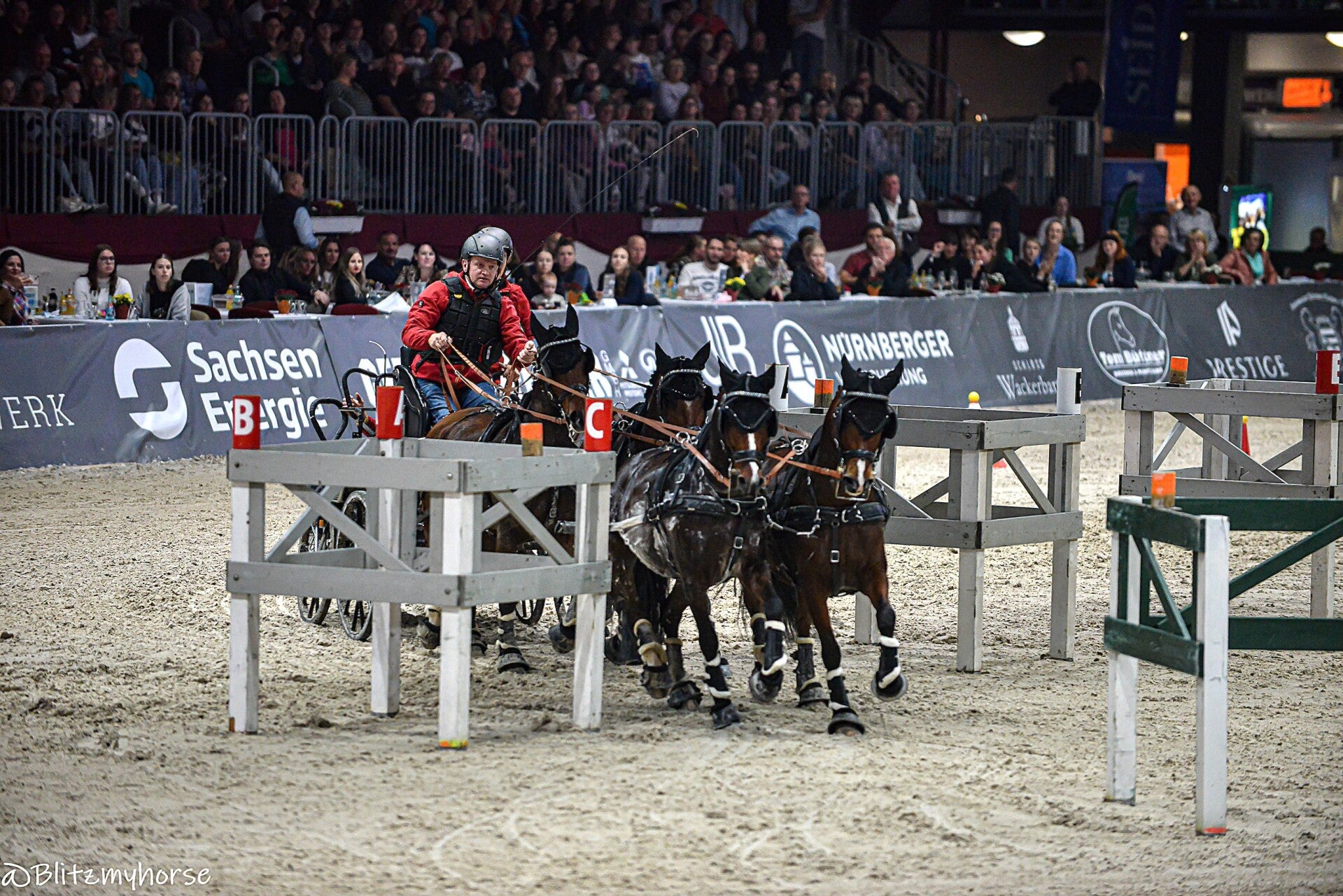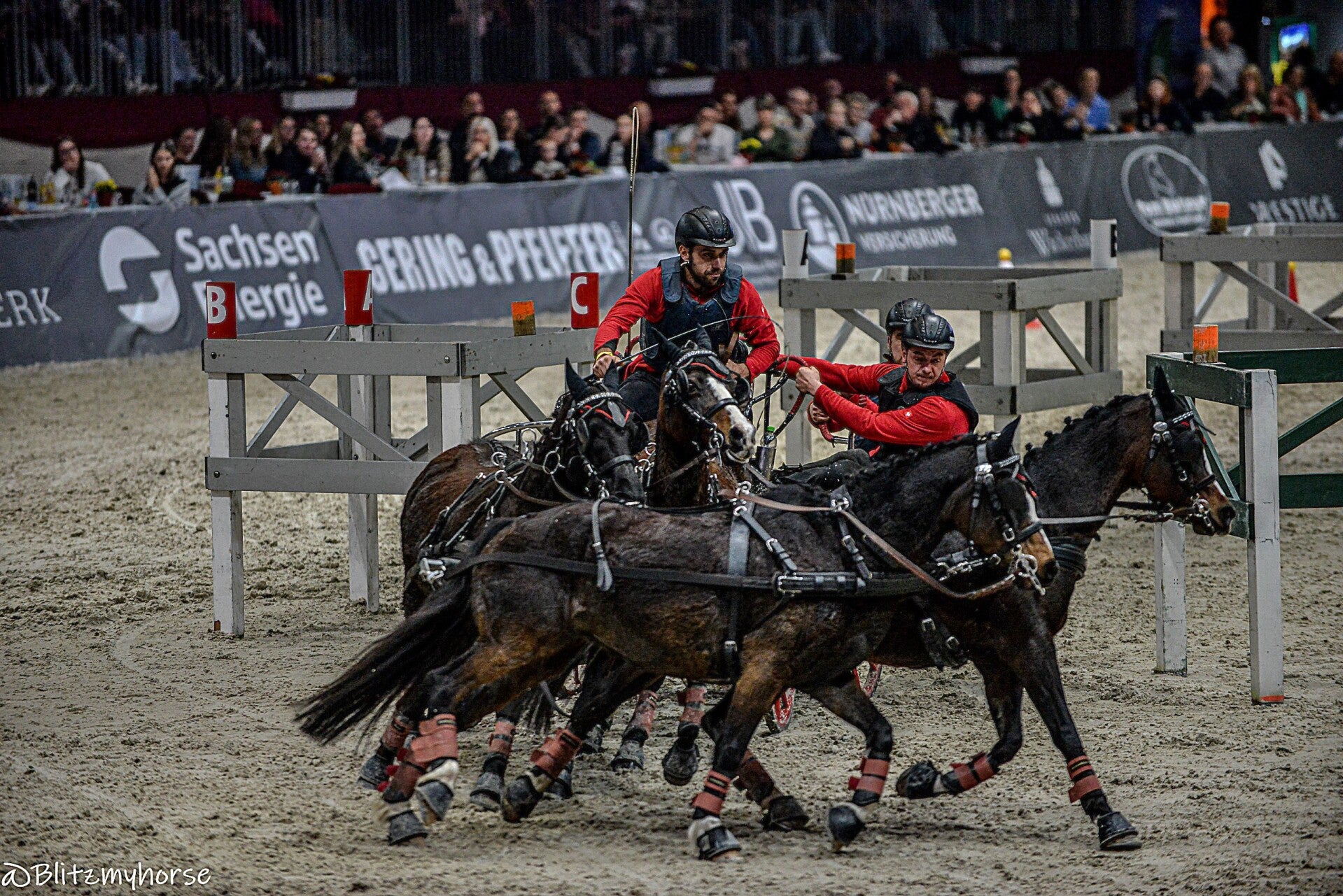 Die Veranstaltung beginnt mit Springreiten, ich werde davon keine Bilder weiter hochladen weil ja hier jetzt schon genug davon sind. Ich nutze die Zeit um weiter an meinen Kameraeinstellungen zu arbeiten. Ich bewege mich zwischen iso 4000 bis 6000 und das mit einem APSC Sensor. Ich könnte mir in den Arsch beißen, dass ich meine beiden Vollformatkameras zu Hause gelassen habe. Dann läuft noch bissel Showprogram, ich geh derweil mal runter und quassel bissel mit dem einen oder andern Bekannten. Dann geht es endlich los. Die Gladiatoren auf ihren Kutschen kommen. Drei Teams fahren gegen einander. Zu jedem Team gehört ein Vierspänner und ein Einspänner