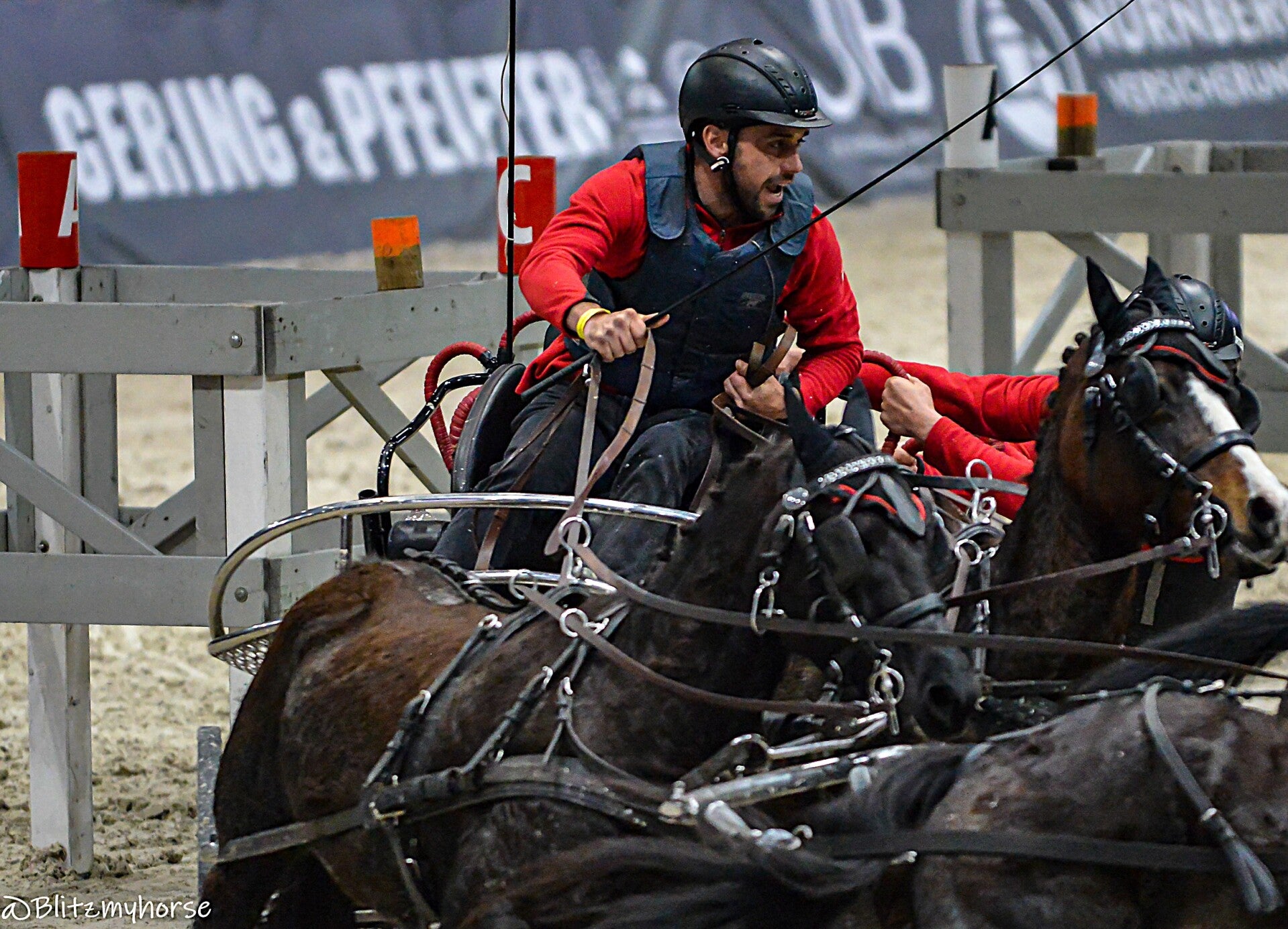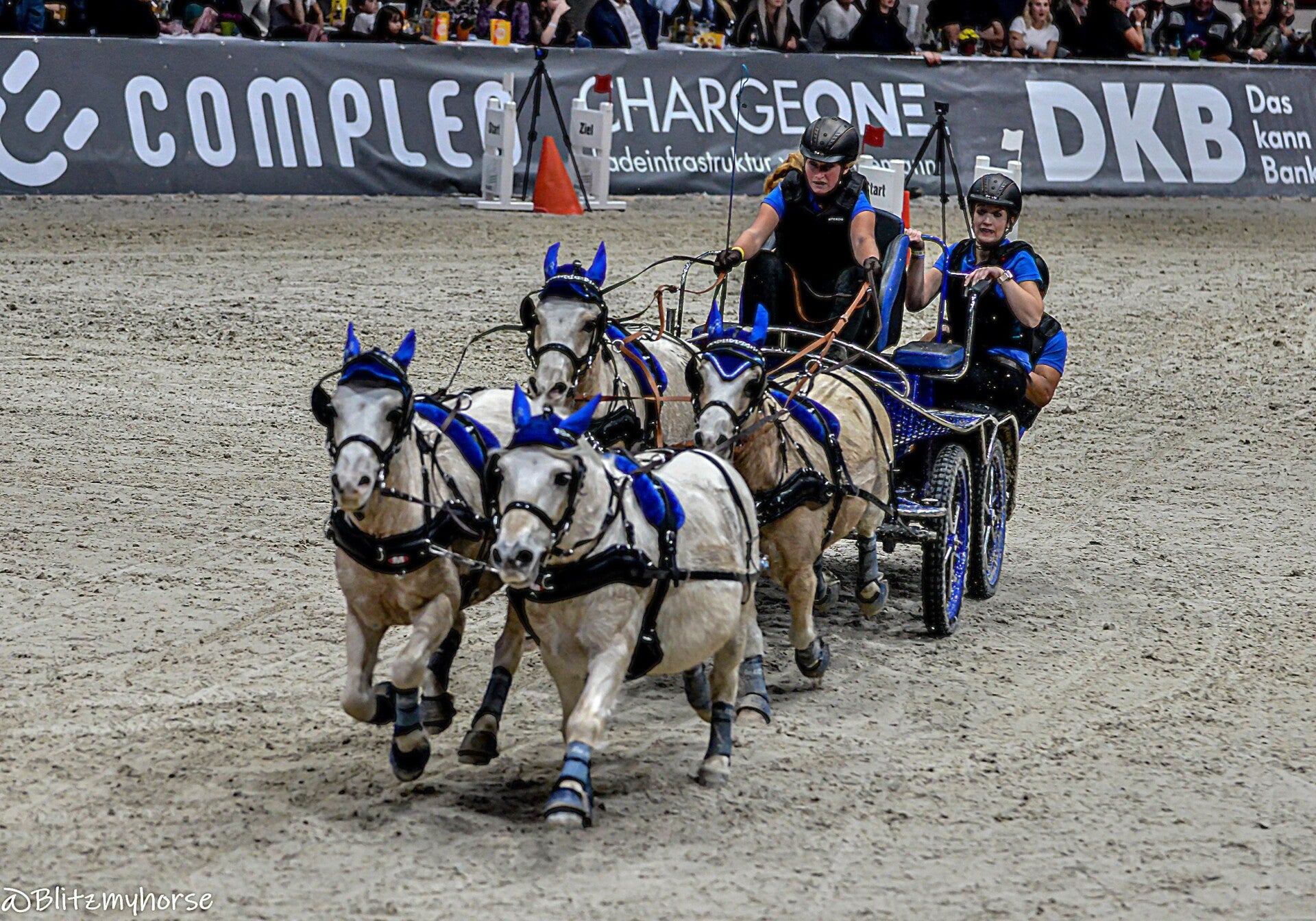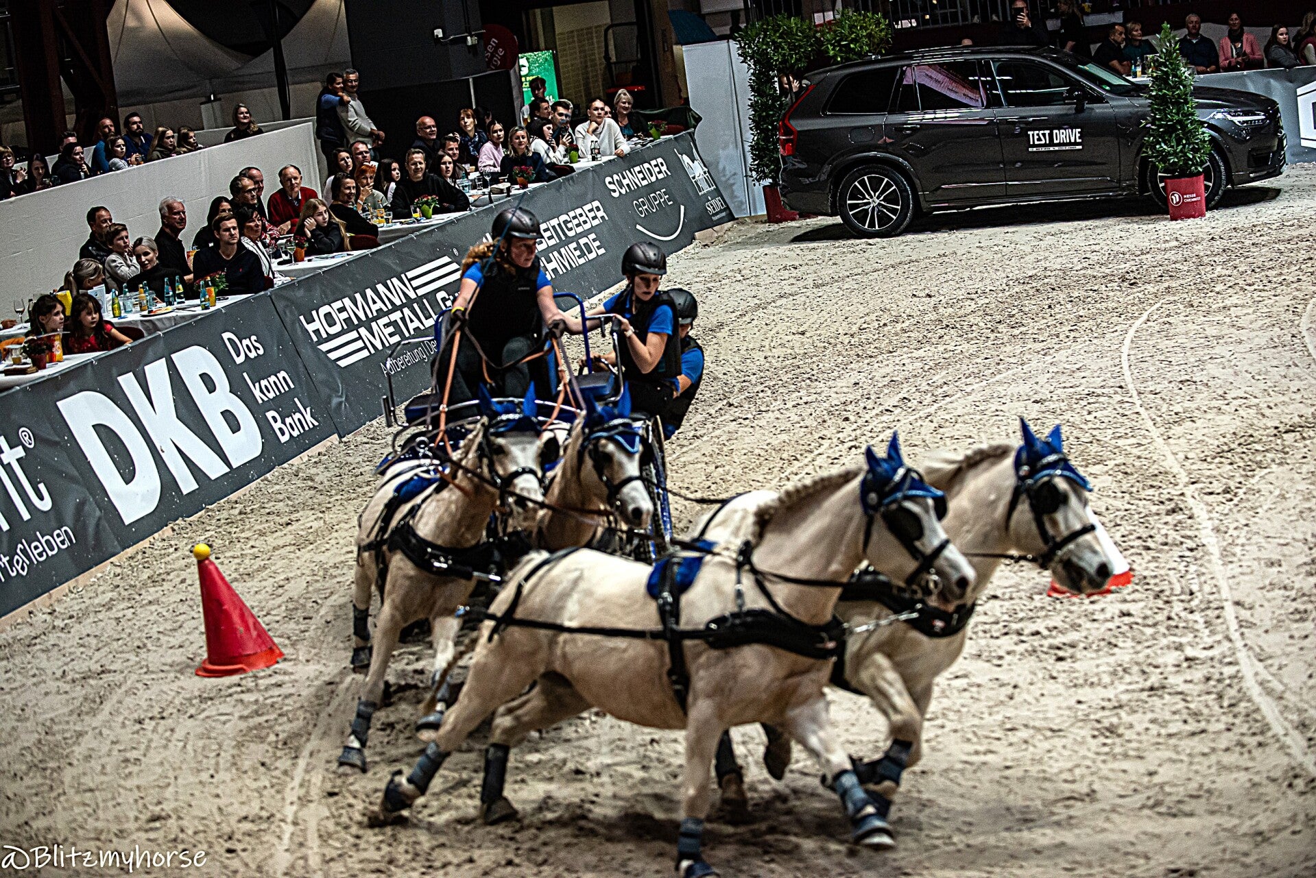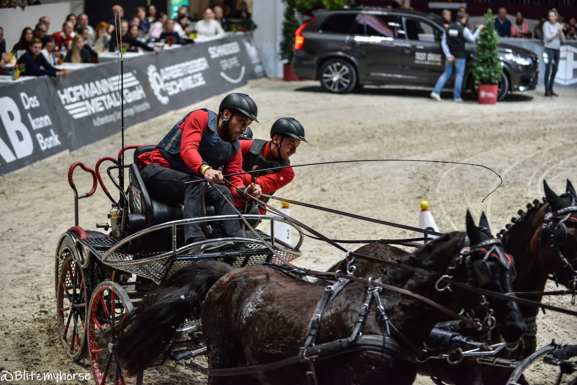 Die Veranstaltung beginnt mit Springreiten, ich werde davon keine Bilder weiter hochladen weil ja hier jetzt schon genug davon sind. Ich nutze die Zeit um weiter an meinen Kameraeinstellungen zu arbeiten. Ich bewege mich zwischen iso 4000 bis 6000 und das mit einem APSC Sensor. Ich könnte mir in den Arsch beißen, dass ich meine beiden Vollformatkameras zu Hause gelassen habe. Dann läuft noch bissel Showprogram, ich geh derweil mal runter und quassel bissel mit dem einen oder andern Bekannten. Dann geht es endlich los. Die Gladiatoren auf ihren Kutschen kommen. Drei Teams fahren gegen einander. Zu jedem Team gehört ein Vierspänner und ein Einspänner