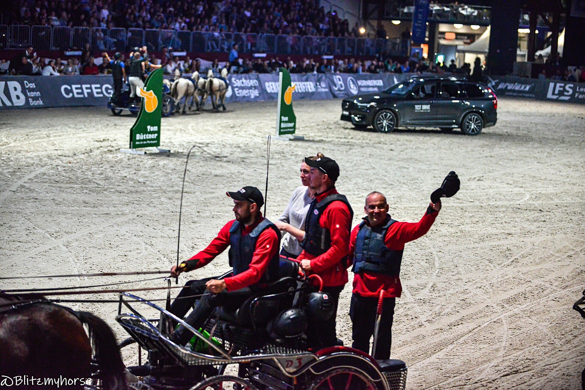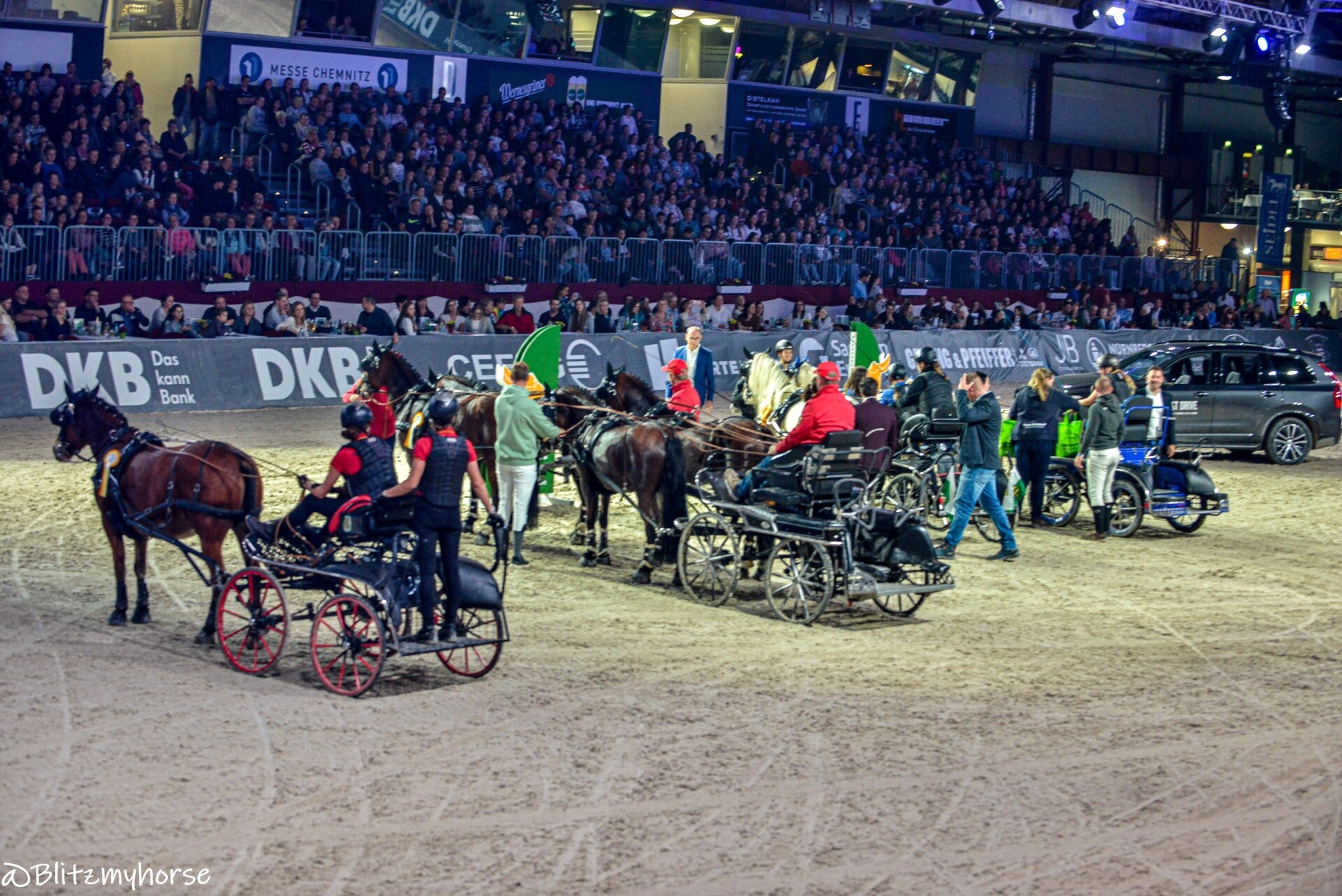 Nach den beiden Prüfungen kam der Punkt der für mich am schwierigsten zu bewältigen ist, dass nachmittägliche Showprogram. Inbegriffen war ein Kostümspringen, einige Auszüge aus der am nächsten Tag stattfindenden Pferdenacht und Teile des CAVALLUNA-Programms. Wenn ich das so schreibe klingt das etwas respektlos, ist aber garnicht so gemeint. Die Leute die an diesem bunten Programm mitwirken geben wirklich ihr Bestes und es versteht auch an vielen Stellen gut zu unterhalten. Und beim Aufmarsch der sächsischen Pferdejugend auch unsere Fahrermädels, worüber wir uns richtig gefreut haben. :)